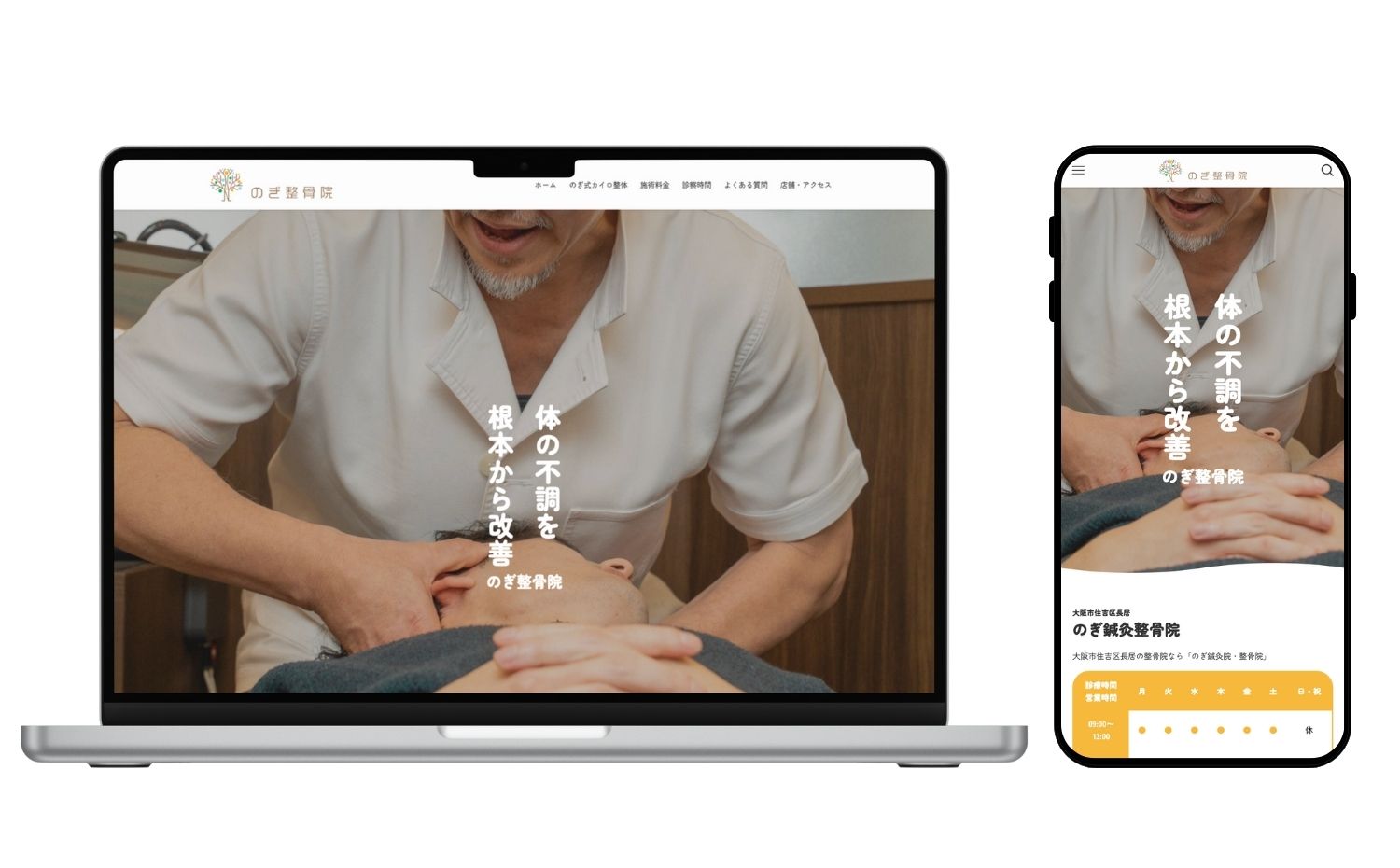 以前のサイトはデザインや構成が古く、スマートフォンでの見づらさや更新のしにくさが課題でした。また、「長居 整骨院」「整骨院 長居」といった地域キーワードでの検索順位が低く、近隣エリアの競合に埋もれていました。