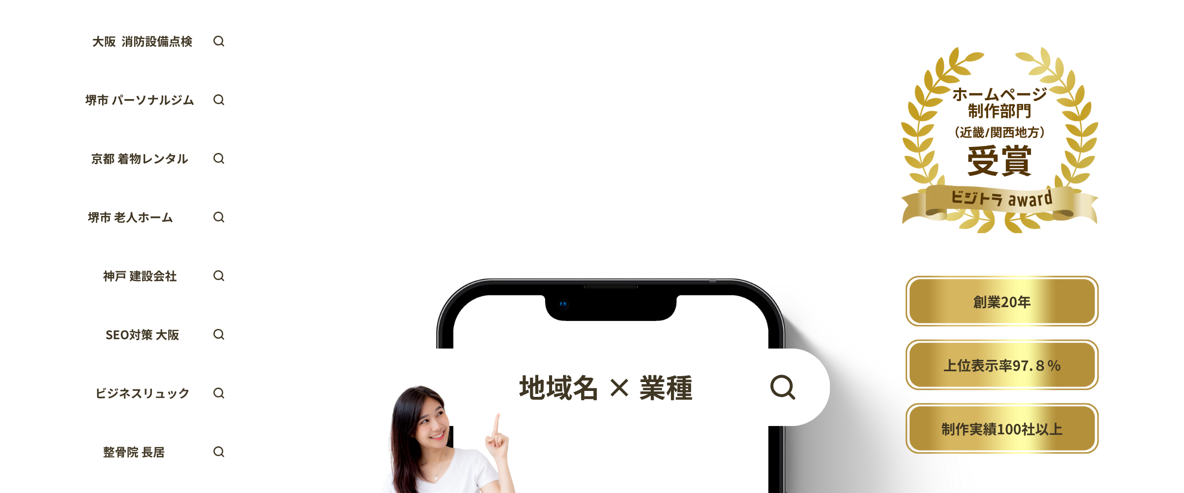 地域キーワードでの上位表示実績も豊富で、「地域名」×「業種」キーワードで1位を多数獲得。オウンドメディアでは月間30万PV以上を獲得。WEB集客でお問い合わせ件数が0件から月40件以上増加するなど、ホームページの運用成績も豊富。