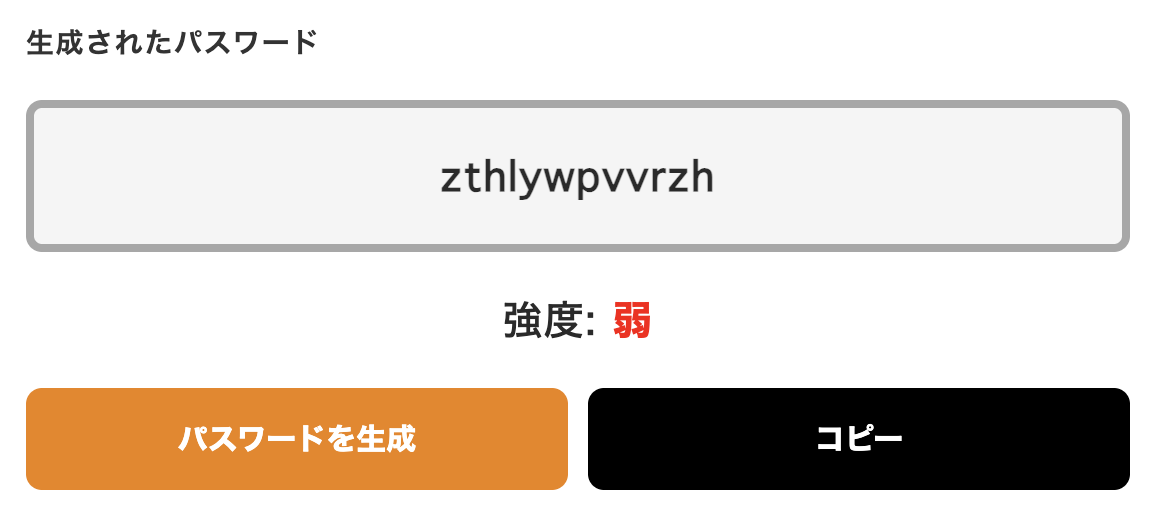 パスワードは指定条件を元にランダムで表示されます。表示されるパスワードは指定条件を多く設定するほど複雑なパスワードを生成することが可能です。
