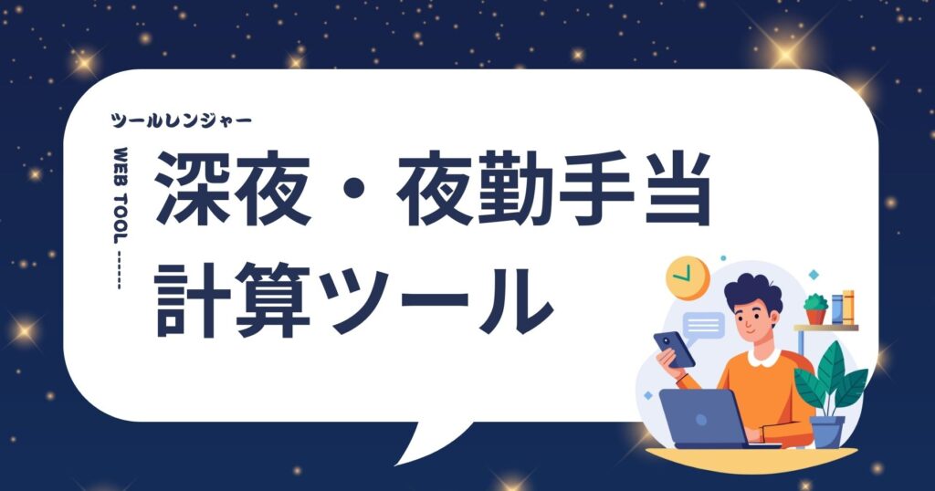 Salary 深夜・夜勤手当の計算ツール このツールは、労働基準法で定められている 深夜労働(22:00〜翌5:00)に対する25%割増賃金 を自動計算します。1回の勤務ごとの給与明細と、月間の夜勤回数を考慮した合計金額を確認できます。さらに、会社や職種によっ... -