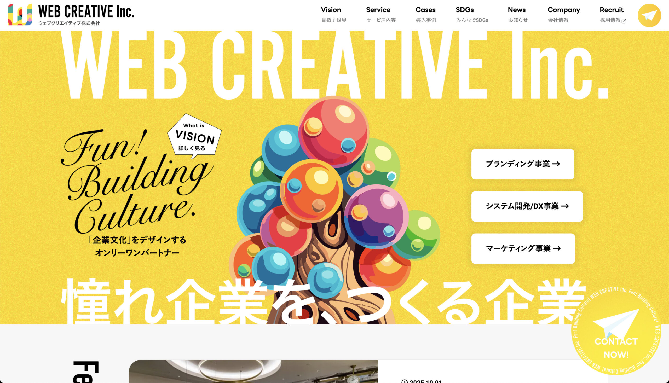 「世界中に“憧れ企業”を。」というビジョンを掲げ、Webサイト制作だけでなく、ブランディング・マーケティング・DX支援・システム開発など、企業の課題解決を多角的にサポートしています。サイトの企画・デザイン・構築から運用・改善、さらには業務効率化までを一貫して対応できる体制を整えており、Web戦略を軸にした企業価値の向上を目指しています。