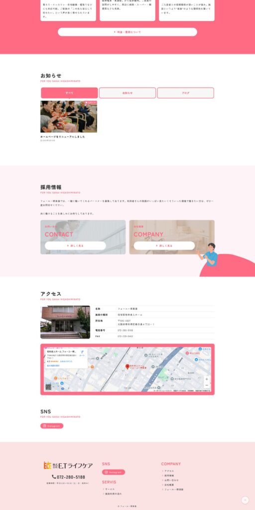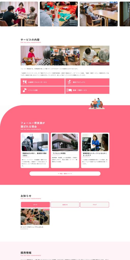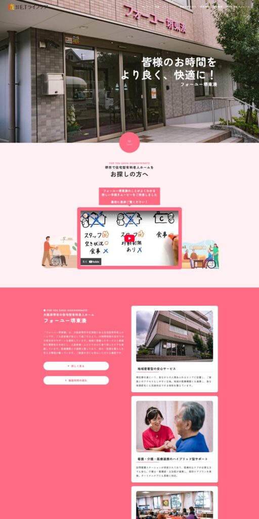 大阪府堺市堺区の「フォーユー堺東湊」様のホームページを新規作成しました。弊社が制作したお絵かきムービーの活用し、施設利用希望のお客様の悩みを解決する動線設計を構築。また、施設の雰囲気がわかりやすいビジュアルを数多く使用し、シンプルで目的達成までの動線をしっかりと作り込みました。